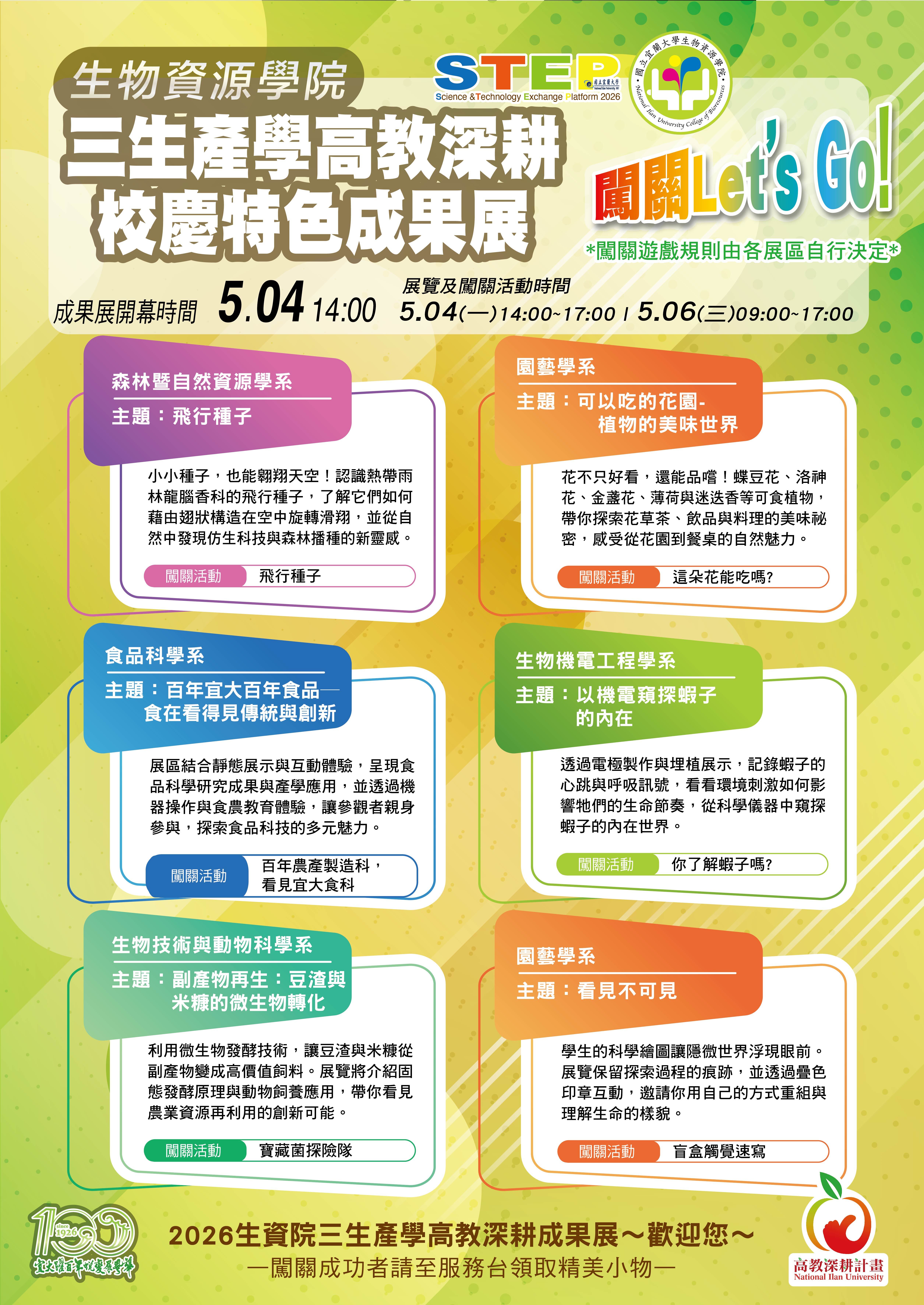🎉【宜大百週年校慶】 🎉2026生物資源學院高教深耕校慶特色成果展-Let's Go!闖關拿好禮!!(宜大學生闖關成功另有專業進取時數2小時)